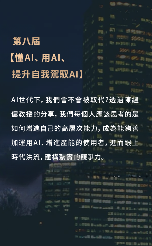 而今年最令我印象深刻的課程,是第2天上午陳縕儂教授對AI的介紹與分析,以及緊接著張天天講師分享的「AI小銷」實際應用,讓我對行業未來的線上、線下整合應用,特別是在主管教育輔導的這個方面,有著充分的期待。